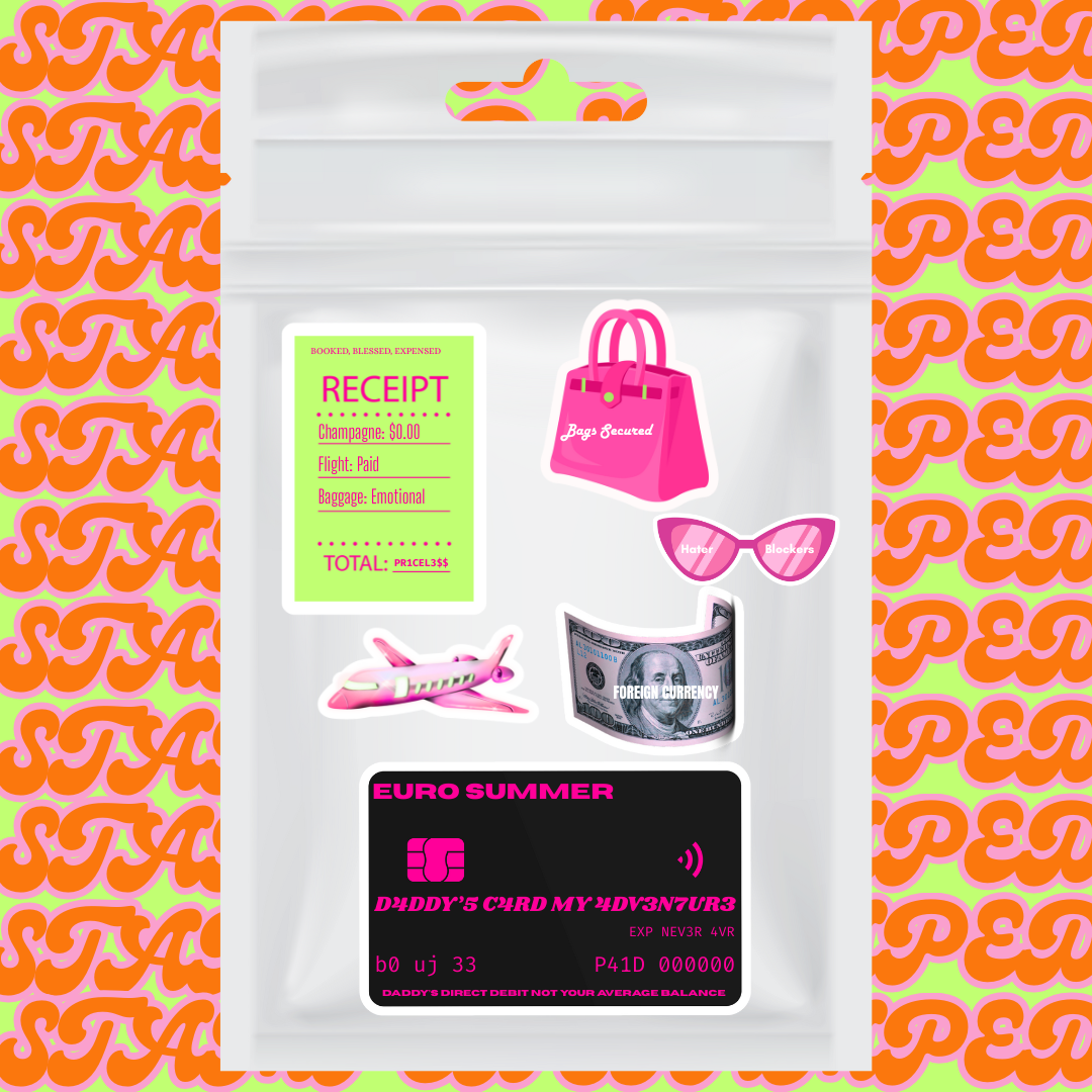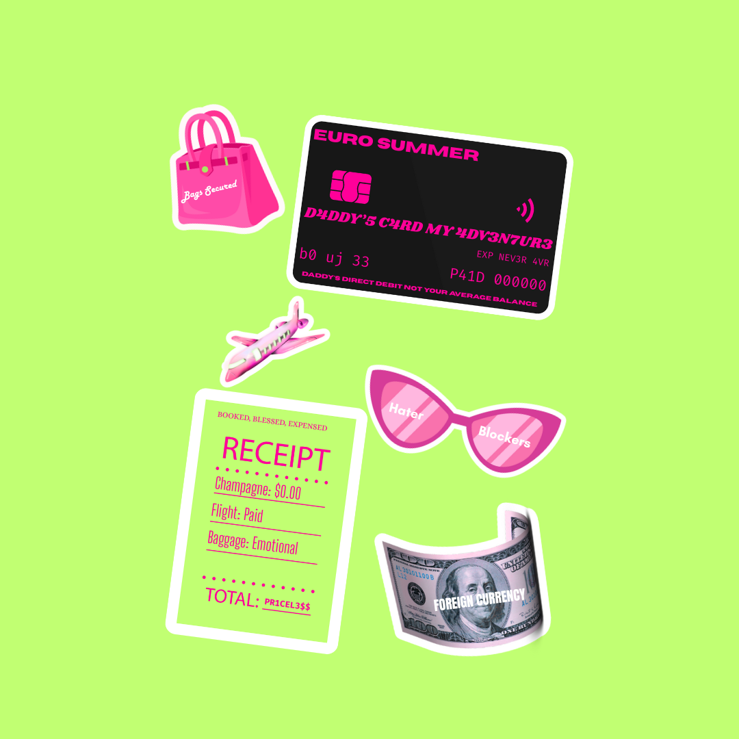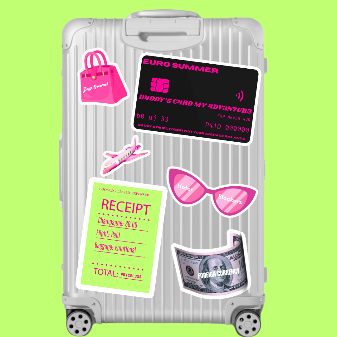 The Passport & Privilege Pack gives designer drama, foreign currency, and unapologetic rich-girl attitude. Designed for bougie trips, balcony spritzes and blocking haters in style, this sticker set turns every bag into a boarding pass.