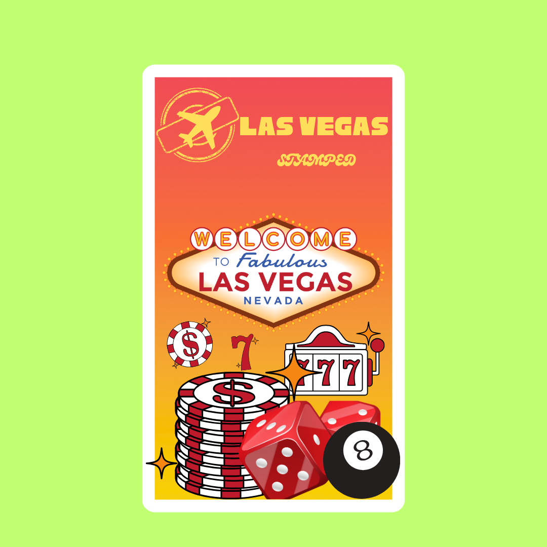 A premium, die-cut travel sticker inspired by the electric buzz of Las Vegas. From bright lights to bold nights, this design marks every mile. Add it to your suitcase, journal or laptop and start stamping your journey.
